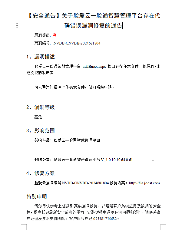 【安全通告】關于臉愛云一臉通智慧管理平臺存在代碼錯誤漏洞修復的通告